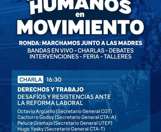 A las 16.30 se llevará a cabo el primer panel de debate denominado “Derechos y Trabajo” dedicado a los “desafíos y resistencias” ante la reforma laboral impulsada por el Gobierno. Participarán los secretarios generales Hugo Godoy (CTA-A); Hugo Yasky (CTA – T), Alejandro Gramajo (UTEP) y Octavio Arguello (CGT).
