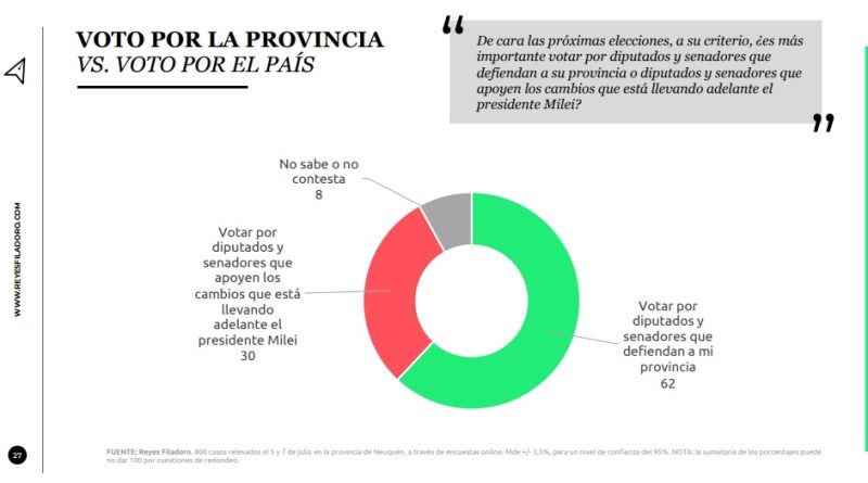También “existe una fuerte demanda de defensa de la provincia ante la Nación”. El 69% de quienes tienen imagen positiva del gobernador cree que su prioridad debe ser defender a Neuquén antes que alinearse con el gobierno nacional. Además, el 57% de ellos considera que Milei está perjudicando a la provincia.